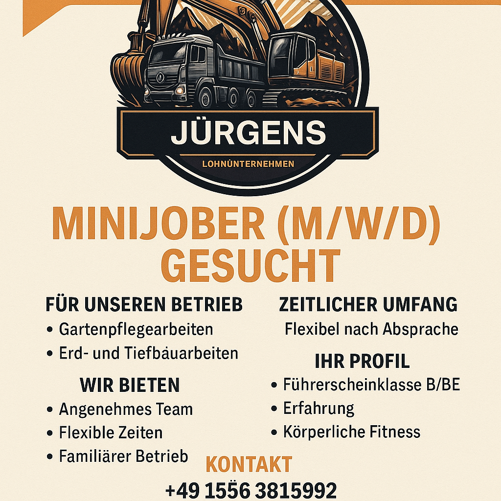 Moin und Herzlich Willkommen bei Jürgens-Lohnunternehmen! Wir packen an, wo andere aufhören – im Haus, Hof und Garten. Mit moderner Technik, viel Erfahrung und einem Blick fürs Upcycling machen wir aus Bestehendem wieder etwas Wertvolles. Ob Erdarbeiten, Grünpflege oder Aufräumen mit Sinn: Wir arbeiten nachhaltig, zuverlässig und bodenständig.👉 Sprechen Sie uns an – wir finden eine gute Lösung.